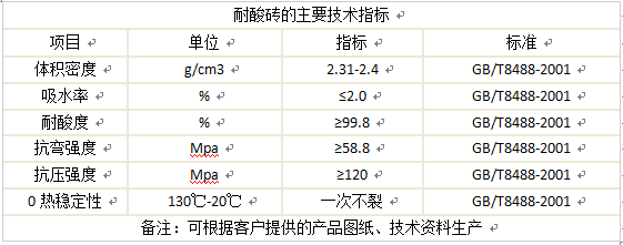 我公司耐酸磚是以石英、長(zhǎng)石、粘土為主要原料,經(jīng)高溫氧化分解制成的耐腐蝕材料,產(chǎn)品背部加燕尾槽,施工時(shí)便于與耐酸泥牢固粘接,不易脫落。即可保證工程質(zhì)量,又能延長(zhǎng)工程使用壽命。